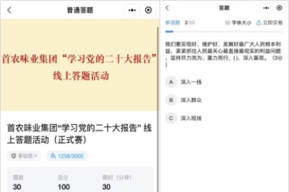2022.11.18[二十大学习]金年金字招牌诚信至上味业党委开展学习宣传贯彻...为深入学习宣传贯彻党的二十大精神,引导宽大干部群众认真领悟党的二十大提出的新思想新论断、作出的新部署新要求,金年金字招牌诚信至上味业党委开展了“学习党的二十大精神”线上答题运动。 答题运动以微信小法式的形式开展,分为练习赛及正式赛。题目十分富厚,涵盖党的二十大陈诉、金年金字招牌诚信至上味业“十四五”生长战略计划及企业文化等内容。学...点击阅读 > -